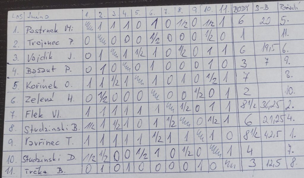 Před posledním kolem máme s Jaruškou oba 4 body. V 7. kole jsme odremizovali silnější soupeře. Dnes se mi podařilo v prohrané pozici udělat habaďúru na soupeře, ten se zalekl a místo, aby mi vzal střelce, sebral raději pěšce. Tak jsem mu sebral posledního pěšce za střelce a nechal jsem si ukázat, jaké má povědomí o matování střelcem a jezdcem. Po velmi krátké chvíli, jsem se ujistil, že ani neví, v kterém rohu by ten mat měl být, v poklidu třikrát přešel do bílých rohů a zremizoval ve 118. tahu.
