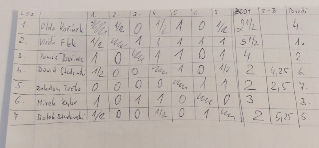 V rapidu zvítězil Jindra Tvrdý, 2. jsem byl já a 3. remízový král David. V blesku se oklepal z výsledku v rapidu Pepa a stal se přeborníkem Stříbrné Skalice (v turnaji vyhrál náš host Martin Čuchna), 2. jsem byl opět já a o 3. místě rozhodly penalty. Tedy nová partie, ve které David porazil Honzu.